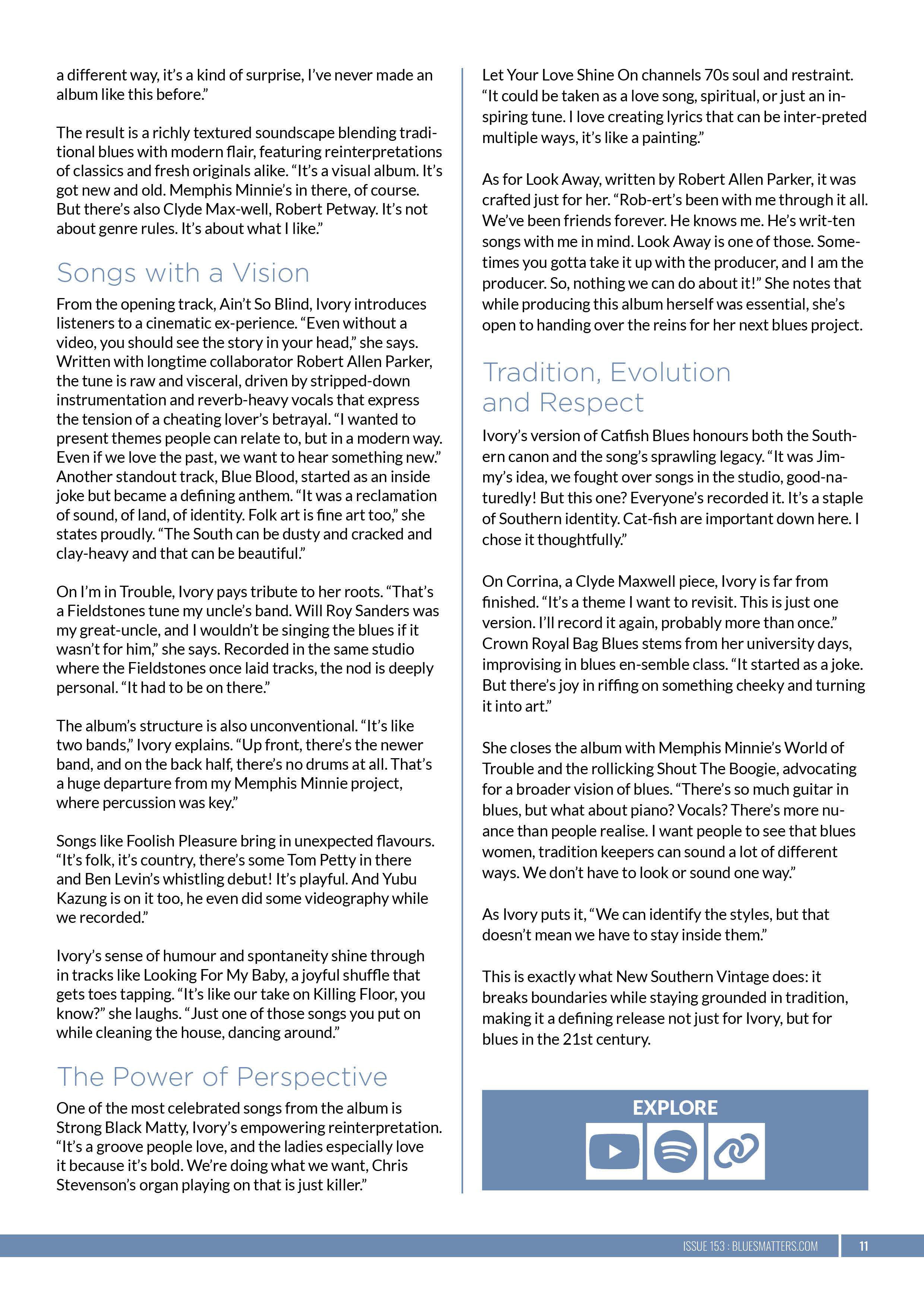 Candice Ivory made a thunderous entrance onto the blues scene in 2023 with the release of When the Levee Breaks: The Music of Memphis Minnie… This collection sees her once again celebrating Southern heritage, under the aegis of New Southern Vintage, an approach she has carefully conceptualized, seamlessly combining tradition and modernity… performed by a cosmopolitan orchestra featuring pianist Ben Levin, guitarist-composer Robert Allen Parker, and guests as diverse as Mississippi veteran Jimmy “Duck” Holmes, musicologists David Evans and Andrew Cohen, and Khari Wynn of… Public Enemy! The repertoire (8 originals and 6 covers, including 2 by Memphis Minnie and one by her great-uncle Will Roy Sanders) and the orchestration (from stripped-down folk to electric blues rock) go off in all directions, but the result never sounds artificial or forced. Several pieces even generate a real thrill.