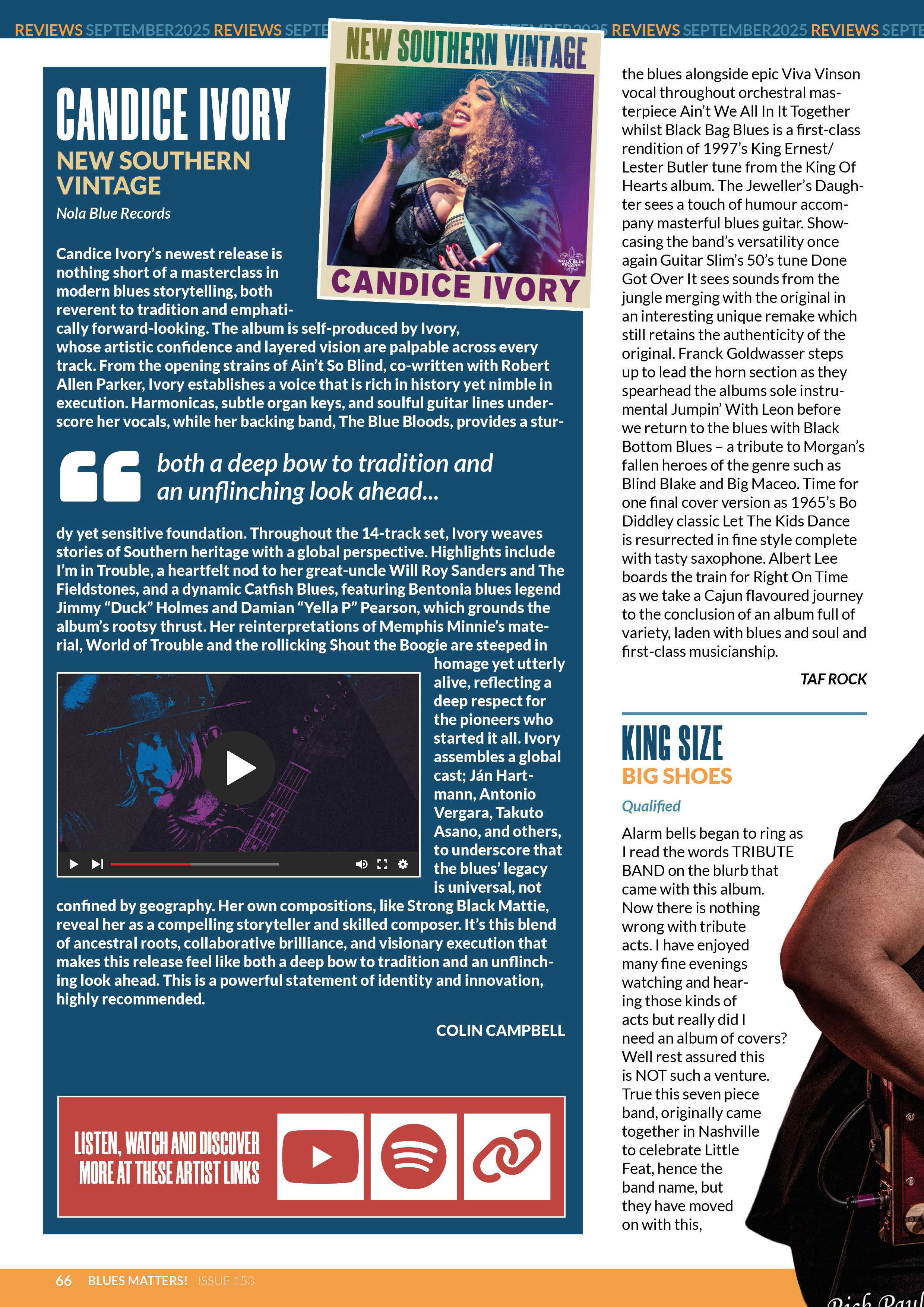 [Candice Ivory’s New Southern Vintage] drives home the universality of the music with the various international artists she brings to the album, the young performers who are adding their music to the genre and the older blues stars still alive and pursuing their own love of the music. And of course, Candice must be recognized for her glorious vocals and the great mixtures of originals and selected covers she brings to show that time does not alter the music and blends well in a new modern showcase.